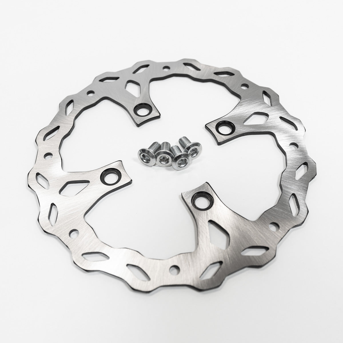 This upgrade kit significantly enhances off-road performance and braking efficiency. Designed for the 13kW and 17kW versions of the upgraded eBike, it addresses the need for a more robust front brake system. After testing various bicycle component brands, we found that none adequately performed under the demands of a powerful eBike, particularly at higher speeds. Traditional bicycle pads struggled with overheating rotors and rapid wear, leading us to incorporate larger brake calipers with thicker pads to minimize maintenance.