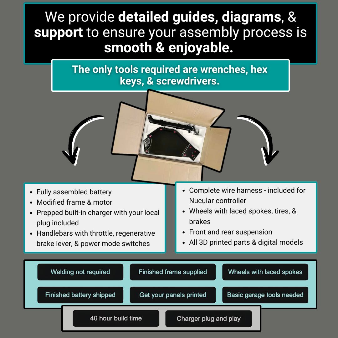 The Ebike V5 Build Kit was designed for DIY enthusiasts, and includes everything you'll need to assemble your Ebike V5. This kit ensures a fun and rewarding experience from the comfort of your own home.